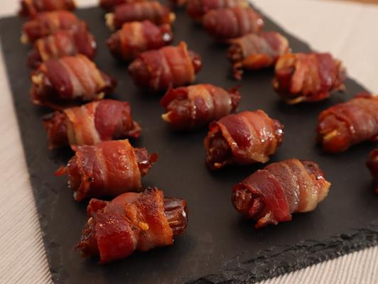 Skerið beikonið í tvennt og vefjið hverri ostafylltri döðlu í beikon.