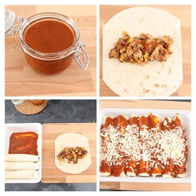 Deilið fyllingunni niður á tortillakökurnar og rúllið þeim upp.