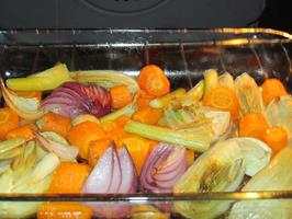 Flysja og skera grænmeti gróft. Setja grænmetið í ofnfat og dreifa olíu, salti og pipar yfir. Baka grænmetið í ofninum við 200°c í 30-40 mín eða þar til það er farið að brúnast.
