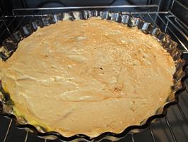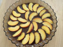 Hellið síðan karamellusósunni í botninn á smurðu formi og raðið ferskjusneiðunum þar yfir.