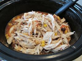 Hálftíma áður en eldun er lokið á að veiða bringurnar upp úr, tæta með gaffli og setja aftur út í pottinn.