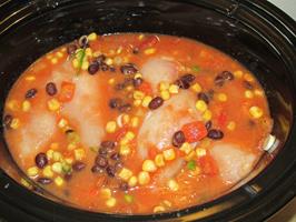 Öllum innihaldsefnum blandað saman í slowcooker og kjúklingabringurnar settar yfir.
