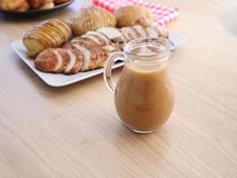 Byrjið á að gera hveitibollu með því að bræða smjör í potti og elda hveiti í 1 mínútu. Vatninu er bætt við smátt og smátt og hrært rösklega til að fá kekkjalausa sósu.