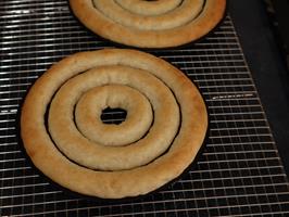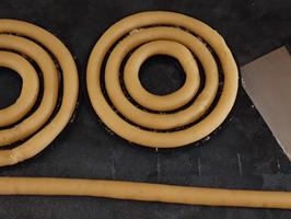 Smyrjið kransakökuformin vel og dustið örlitlu af fínmöluðu semolina mjöli til að koma í veg fyrir að deigið festist í formunum.
