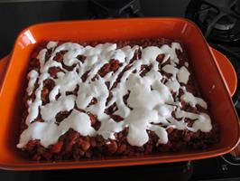Raða hakkrétti og lasagna plötum til skiptis. Enda á hakkrétti og dreifa hvítu sósunni og osti yfir.