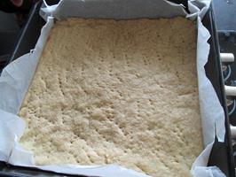 Hita ofninn í 160°c. Klæða 20 cm ferkantað mót með bökunarpappír. Vinna saman hveiti, salt og sykur í matvinnsluvél. Hnoða hráefnum saman í botninn og þjappa með fingrunum í kökuformið. Pikka með gaffli. Baka í 30 mín. Láta kólna alveg áður en næsta skref hefst.