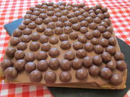 Bræða að lokum rjómasúkkulaðið yfir vatnsbaði og smyrja yfir karamelluna. Hella Maltesers kúlum yfir. Láta súkkulaðið stífna aðeins og skera síðan í bita.