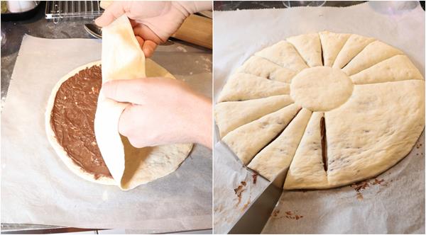 Smyrjið nutella súkkulaðismjöri á fyrstu kökuna, leggið næststa deighluta yfir og smyrjið aftur, endurtakið með þriðja hlutann. Leggið síðasta hlutann yfir (ekki smyrja nutella á síðasta).