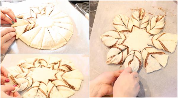 Setjið glas á miðju hringsins og skerið 16 sneiðar (eins og pizzasneiðar) en stoppið við glasið. Takið glasið í burtu og snúið upp á hverja sneið (takið tvo hluta í einu og snúið upp á í sitt hvora áttina). Þegar búið er að snúa upp á alla hlutana má taka tvo og tvo saman og klemma endana saman.