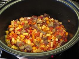 Skera grænmetið í litla bita. Brúna kjötið og mýkja laukinn í potti. Rífa eða pressa hvítlaukinn út í og bæta öllu hinu útí nema gulrót og kartöflu. Sjóða í 2-3 klst. Bæta kartöflu og gulrótum samanvið og sjóða í 30 mín í viðbót.
